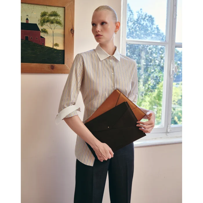 Zeytin derisinden üretilen Envelope; geleneksel deri işleme teknikleri kullanılarak, el işçiliğiyle üretilir. Owlish Studio logolu %100 pamuk toz çantası ve geri dönüştürülebilir özel kutusuyla paketlenir.