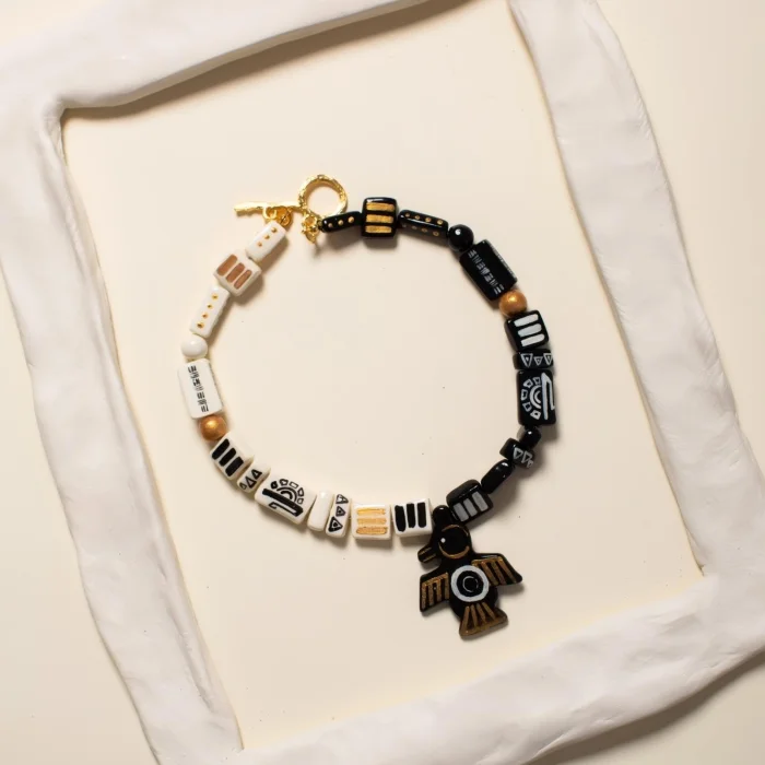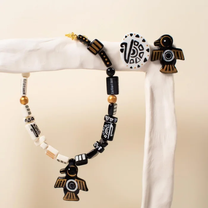 Tüm parçalar kilden elde şekillendirilmiştir, desenleri el boyamasıdır. Metal parçalar altın kaplamadır. İki klips arası kolye uzunluğu 48 cmdir. *Belirtilen ürün ölçüleri yaklaşık değerlerdir, her parça için biraz değişebilir.
