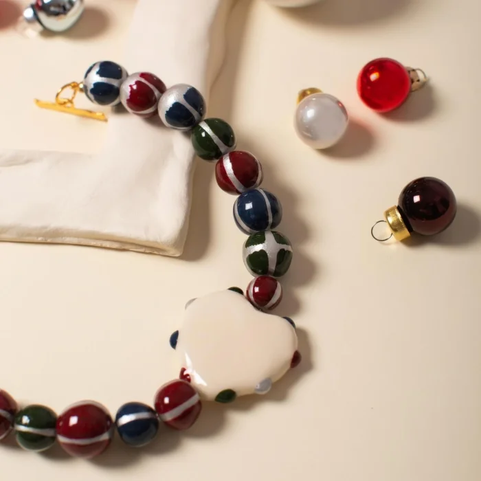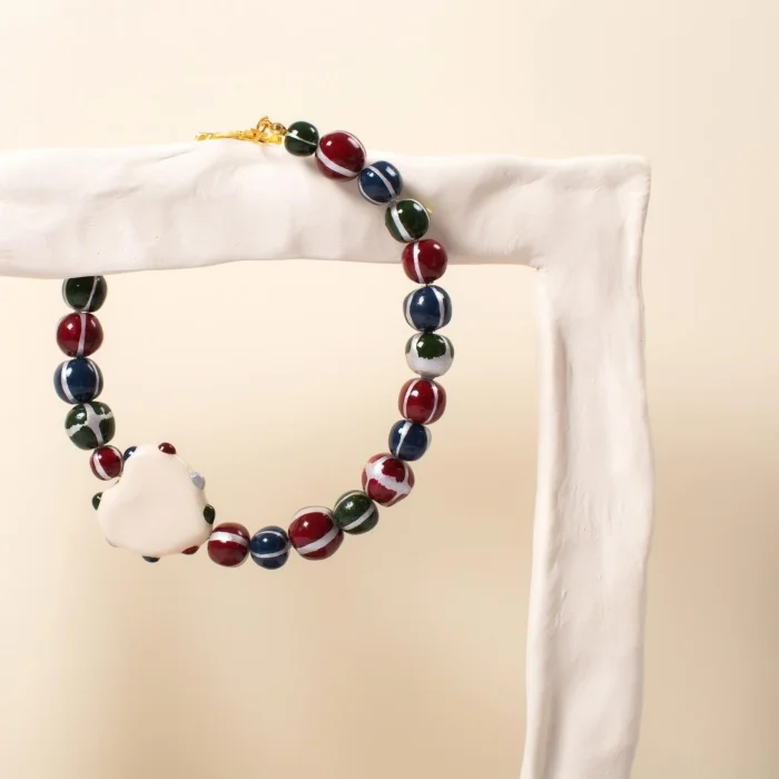 Tüm parçalar kilden elde şekillendirilmiştir, desenleri el boyamasıdır. Metal parçalar altın kaplamadır. İki klips arası kolye uzunluğu 46 cmdir. *Belirtilen ürün ölçüleri yaklaşık değerlerdir, her parça için biraz değişebilir.