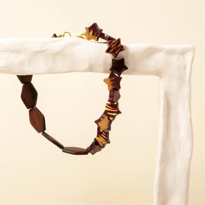 Yıldız parçalar kilden elde şekillendirilmiştir, desenleri el boyamasıdır. Kahverengi geometrik parçalar ahşap, metal parçalar altın kaplama pirinçtir.