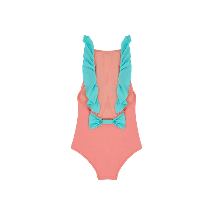 Halter yakalı, pembe kumaş üzerine yeşil fırfır detaylı ve arkasında yeşil fiyonk detaylı mayo. Elde yıkama yapılmalı. Sabun kullanılmamalı. Ütülenmemeli. Düz bir şekilde sererek kurutulmalı. • Kumaş: %80 Poliamid %20 Elastan • Astar: %75 Poliamid %25 Elastan. 2-3 Yaş. Tam bedeninizi tercih ediniz.