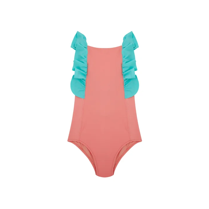 Halter yakalı, pembe kumaş üzerine yeşil fırfır detaylı ve arkasında yeşil fiyonk detaylı mayo. Elde yıkama yapılmalı. Sabun kullanılmamalı. Ütülenmemeli. Düz bir şekilde sererek kurutulmalı. • Kumaş: %80 Poliamid %20 Elastan • Astar: %75 Poliamid %25 Elastan. 2-3 Yaş. Tam bedeninizi tercih ediniz.