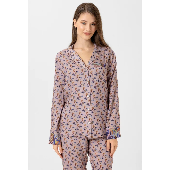 Lila, çiçek desenli özel dijital baskı, Hera pijama takım. Kol ve paçalardaki farklı desen şık bir görünüm sunar. Kemeri sayesinde pantolon belinize göre ayarlanabilir. Önden düğmeli üstü emzirenler için kullanım kolaylığı sağlar.
