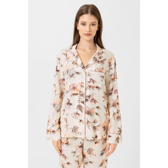 Krem rengi, pastel çiçek desenli, özel dijital baskı, Hera pijama takım. Gül kurusu biyeleri şık bir görünüm sunar. Kemeri sayesinde pantolon belinize göre ayarlanabilir. Önden düğmeli üstü emzirenler için kullanım kolaylığı sağlar.