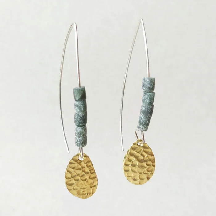 Mat, buğulu yeşil şarnel cam diziler, antik dönemden kalkıp, pirinç pullar ile uyum içinde dans etmek için günümüze gelmiş gibidir.