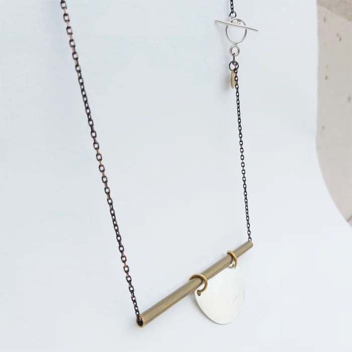 Dengede Kal isimli kolyede, dörtgen kesitli siyah okside pirinç zincir, pirinç şarnel ve 925 ayar gümüş kullanılmıştır.