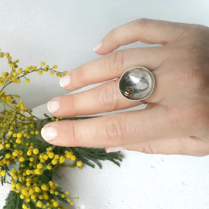 Yuvarlak konkav ince gümüş gövdeye kondurulmuş pirinç tohumlardan oluşan okside edilerek karartılmış, kolu ayarlanabilir özel yapım bir yüzüktür. (Yine de listeden parmak ölçünüzü seçerseniz yüzüğünüzün parmağınıza çok büyük veya çok dar olmasını engelleriz.)
