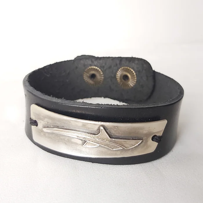 İnce deri kayışta gümüş veya bronz köpekbalığı figür ile çalışılmış uniseks bileklik. Çıtçıtı ayarlanabilir kol. Maskülen, aykırı.