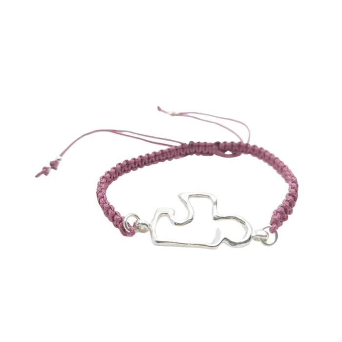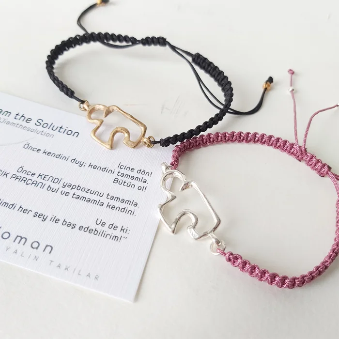Kayıp mum tekniği ile gümüşe dökülen sembol yapboz parçasının, renkli ve ayarlanabilir örgü bileklik ile eşlendiği bu tasarım, hikaye kartı ile gelir.