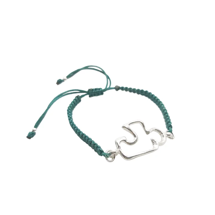 Kayıp mum tekniği ile gümüşe dökülen sembol yapboz parçasının, renkli ve ayarlanabilir örgü bileklik ile eşlendiği bu tasarım, hikaye kartı ile gelir.