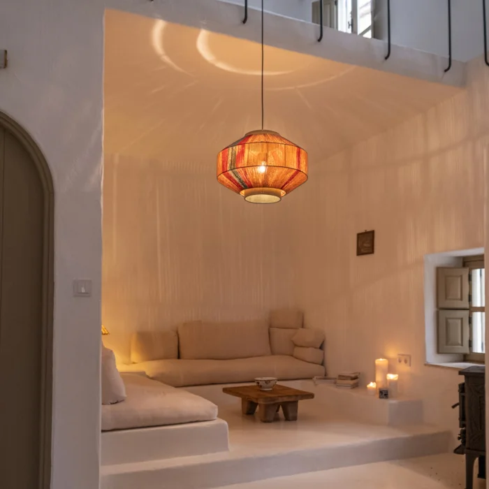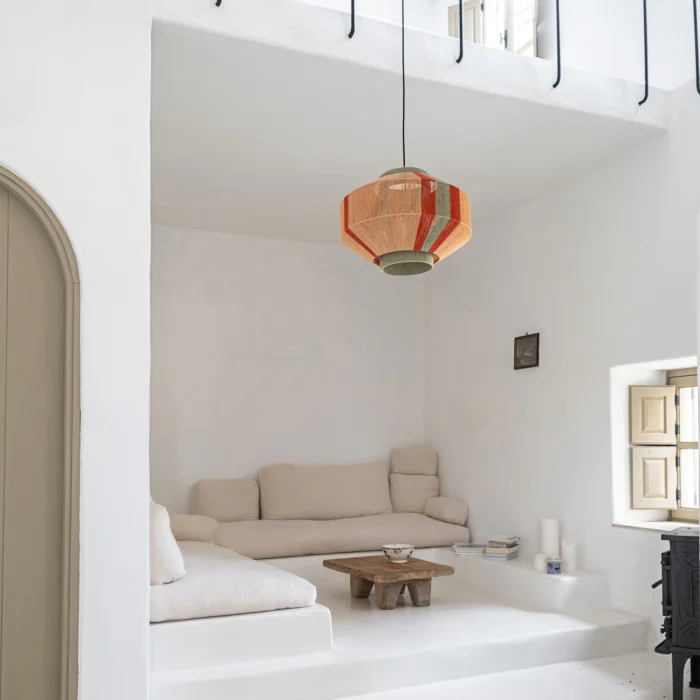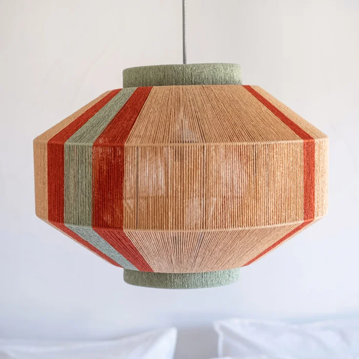 *İskeleti 3mm çelik teldir ve üstü kağıt iple kaplanmıştır. *80cm kumaş kablosu ve tavana sabitlemek için demir aparatı bulunur. (siyah veya beyaz) *E 27 ampullerle uyumludur. *Çizgili gölge etkisi için 100W ampul önerilir.