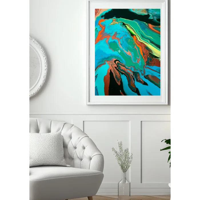 Tuval üzerine akrilik dökme tekniği uygulanıp, yüzeyi için parlak vernik kullanılmıştır.