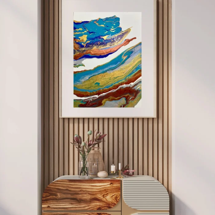 Tuval üzerine akrilik dökme tekniği uygulanıp, yüzeyi için parlak vernik kullanılmıştır.