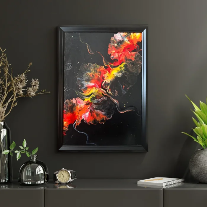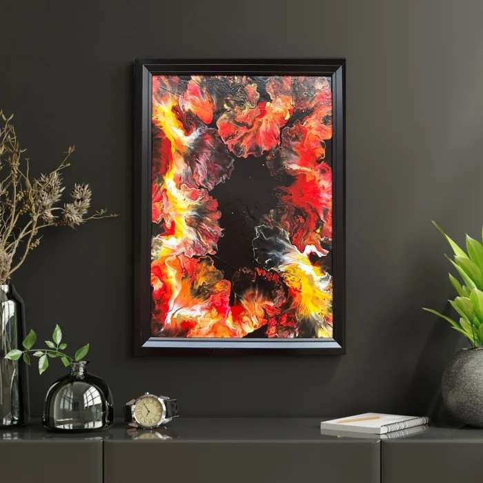 Tuval üzerine akrilik dökme tekniği uygulanıp, yüzeyi için parlak vernik kullanılmıştır.