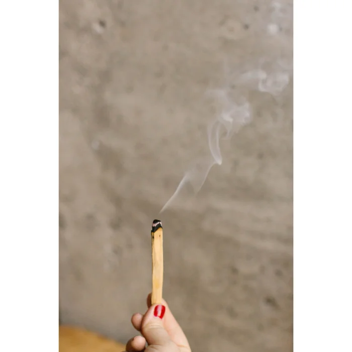 Palo Santo'nuzun ucundaki en fazla 1 cm lik kısmı homojen bir şekilde yakın. Oluşacak minik alevi çok kısa bir süre koruyup sonrasında hızlıca sallayarak söndürün. Yayılan dumanı bedeninizde ve bulunduğunuz alanda gezdirin.