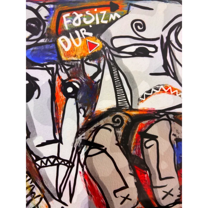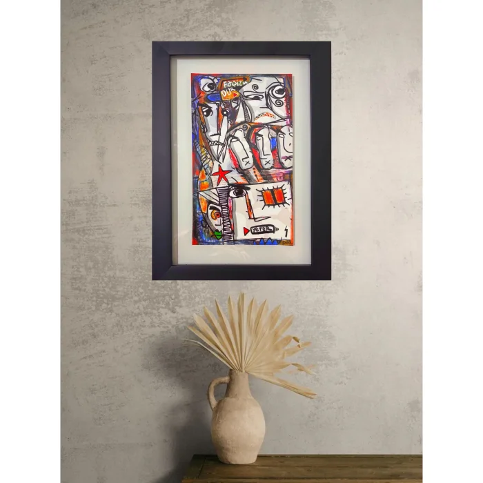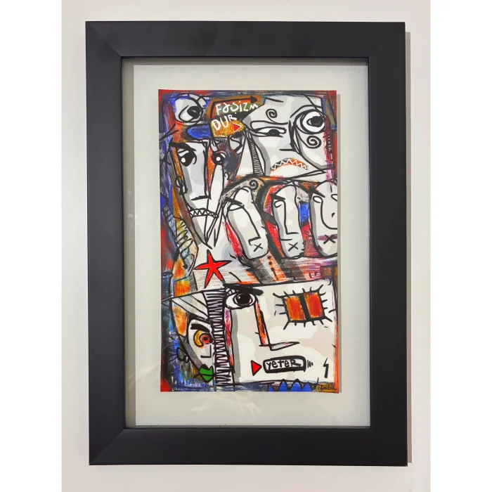26x36 cm ebatlarında çerçeveli askı aparatlı Hahnemühle 320 gr kağıt üzerine fine art baskı orjinal postmoder resim. Eser iki cam arası çerçevelidir.