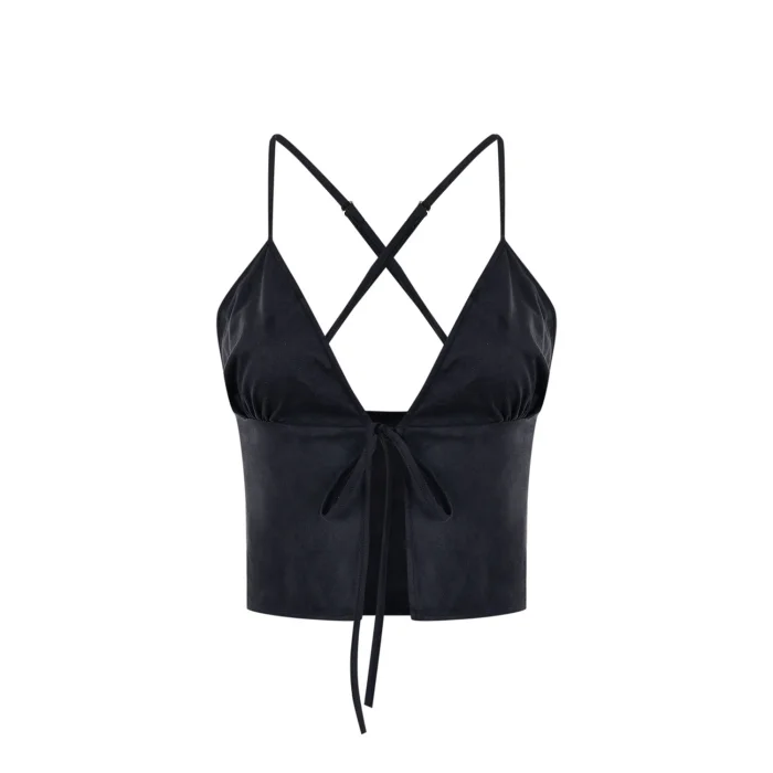 askı ayarlı önden bağlamalı siyah suni süet- şık rahat kadın üst / top.