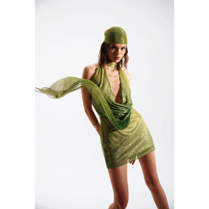 Yeşil degrade geçişli , esnek parlak kumaş özellikli , boyundan bağlama detaylı, derin sırt ve göğüs dekolteli mini elbise