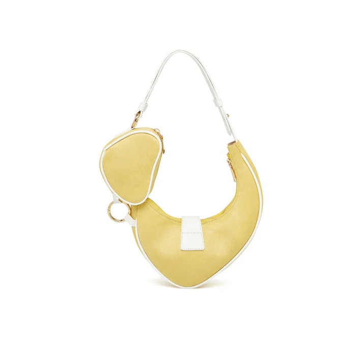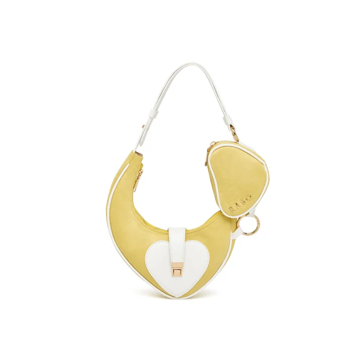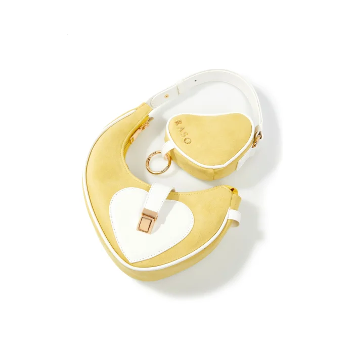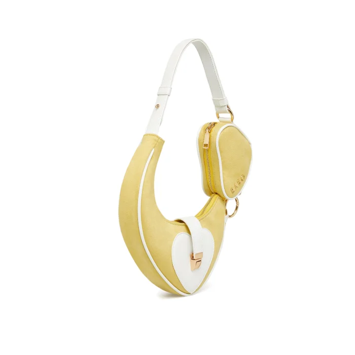 Farklı boyutlardaki kalp formlarının birleşimiyle tasarlanan bu model, alışılmış çanta formlarının dışına çıkarak dikkat çeker. Süet kumaş ve vegan derinin kombinasyonu, hem günlük hem de özel kullanıma uygun şık bir görünüm sunar. Ayarlanabilir askısı sayesinde kol, çapraz veya bel çantası olarak kullanılabilir.