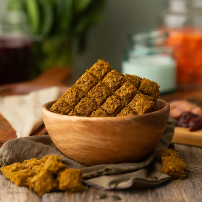 Yem tipi: Tam Yem Ağırlık: 300 GR ME 4216 kcal/kg, Ham Protein %42,69, Ham Yağ %34,11, Selüloz %1,02, Nem %1,12, Ham Kül %4,79; İçindekiler: İçindekiler: Mezgit, Dana Yürek, Dana İşkembe, Dana Billur, Zeytinyağı, Dana Ciğer, Yumurta, Fermente Kabak, Fermente Pancar, Fermente Havuç, Ispanak, Elma, Kefir, Lor, Kabak Çekirdeği Tozu, Keten Tohumu, Yumurta Kabuğu Tozu, Zerdeçal, Karabiber; Deri hassasiyeti ve alerjik problemleri olan evcil hayvanların güvenle tüketebileceği bir tam mamadır; Ana protein kaynağı olarak mezgit kullanıldığından yağ oranı düşüktür; Kilolu hayvanlar için tercih edilmesi uygundur;