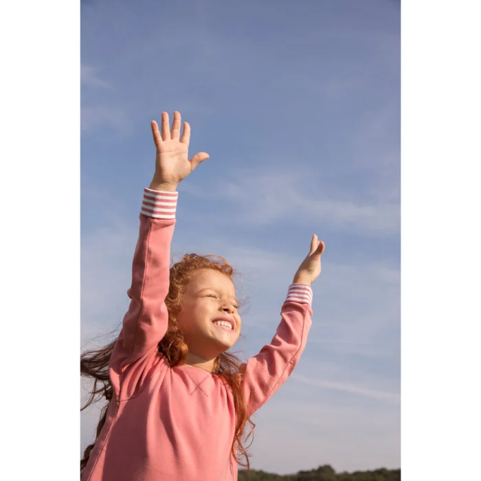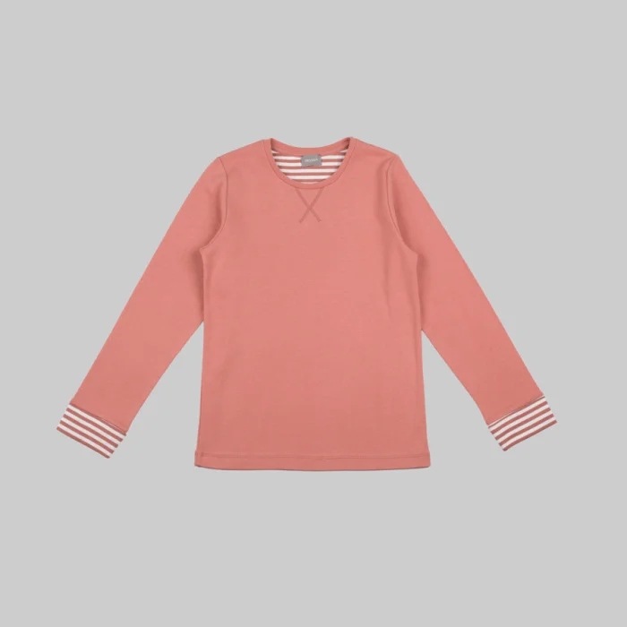 Uzun kollu yuvarlak yakalı tişört, çizgili kumaştan kol detaylı.