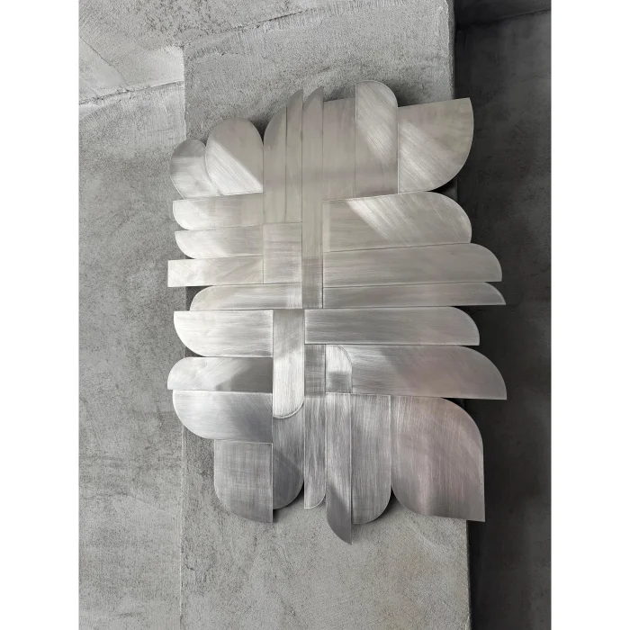 Silver Harmony No. 1, paslanmaz sacdan üretilmiş, geometrik denge ve ritmi temsil eden özgün bir duvar çalışmasıdır.