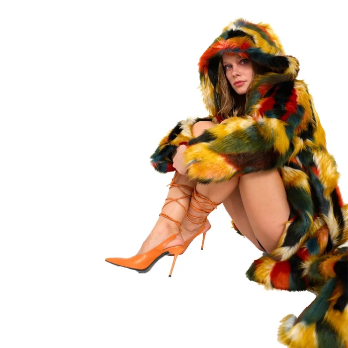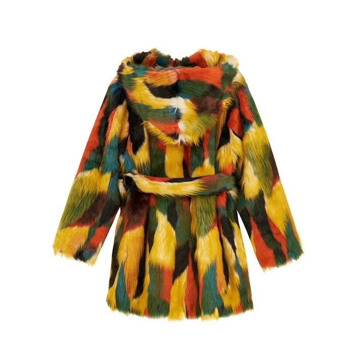 - Kapüşonlu, kemerli, cepli peluş kaban.