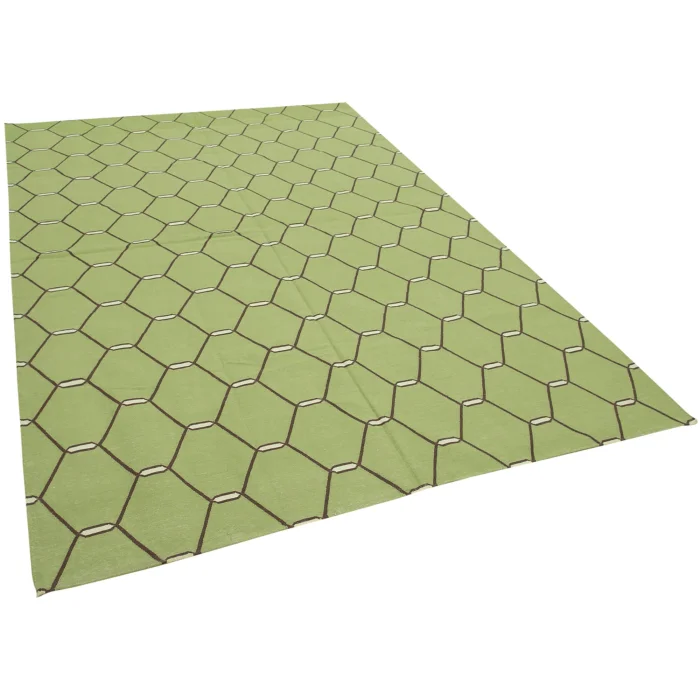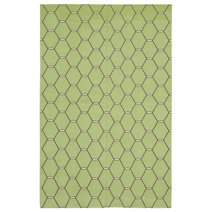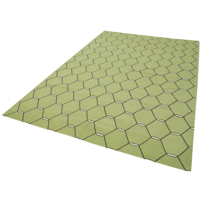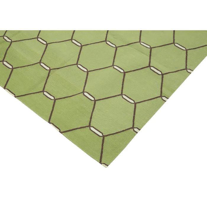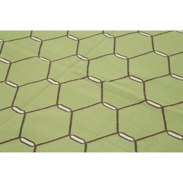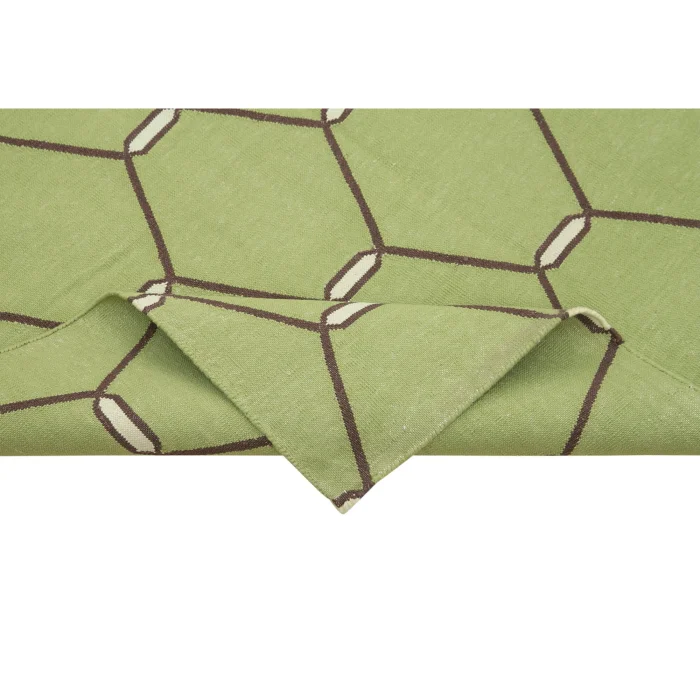 Geometrik Desenli Dhurrie Kilim 185 cm genişliğinde 282 cm uzunluğunda 5 mm kalınlığındadır ortalama 6 kg ağırlığındadır. Elde eğrilmiş %100 Organik Yün ve Pamuk ile imal edilmiştir. Doğal yollardan elde edilen kök boya kullanılmıştır.