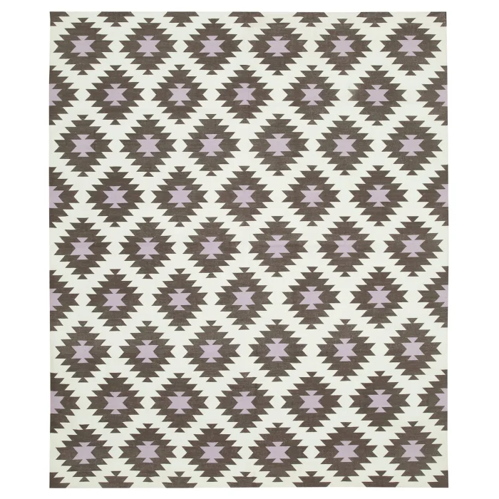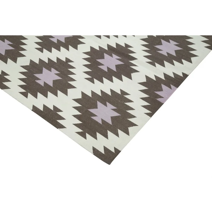 Geometrik desenli Dhurrie kilim, geleneksel el dokuma teknikleriyle titizlikle hazırlanmıştır.