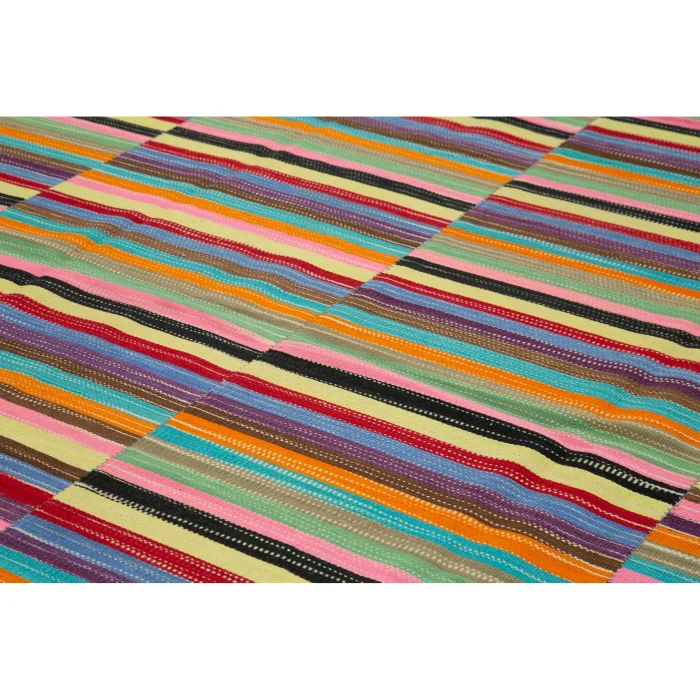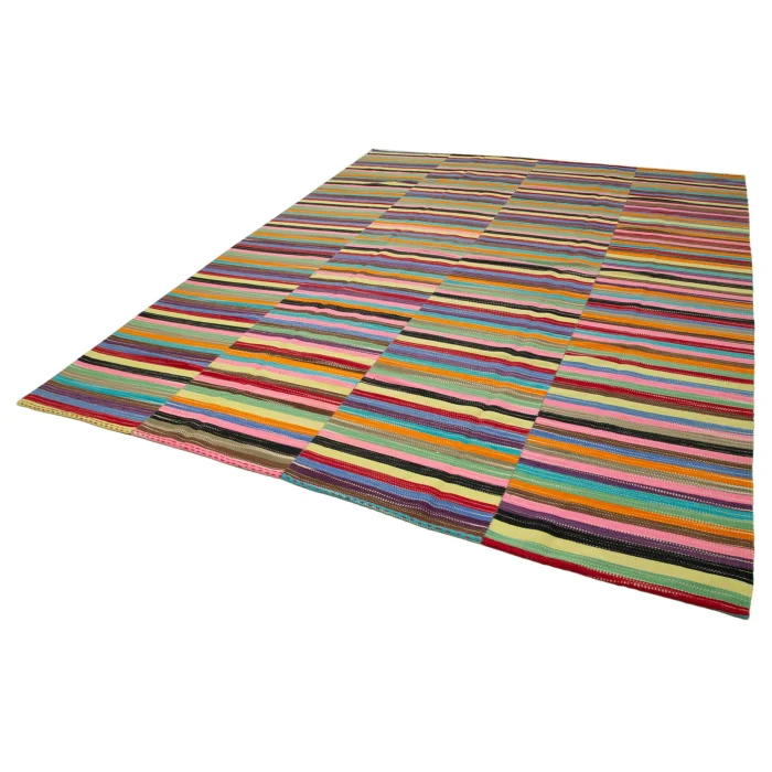 Modern Kilim 296 cm genişliğinde 389 cm uzunluğunda 5 mm kalınlığındadır ortalama 20 kg ağırlığındadır. Elde eğrilmiş %100 Organik Yün ve Pamuk ile imal edilmiştir. Doğal yollardan elde edilen kök boya kullanılmıştır.