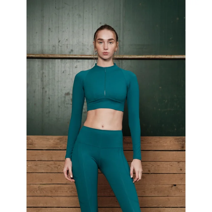 - Uzun kollu, yuvarlak yaka, tona ton önden fermuarlı spor sütyeni.