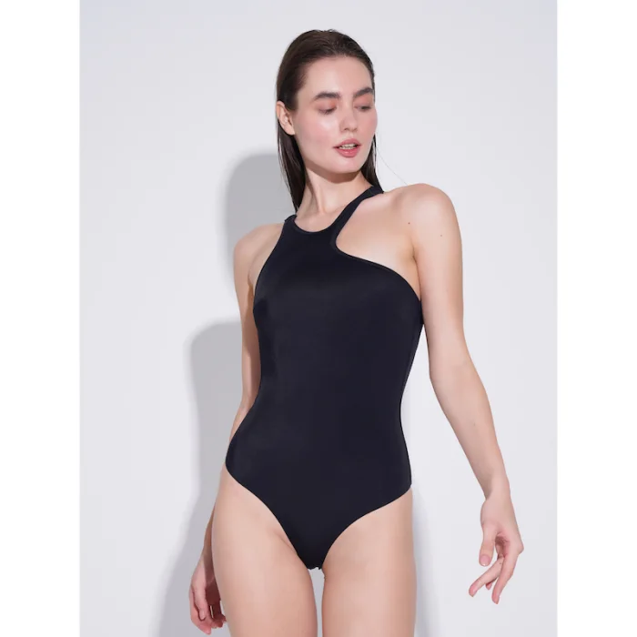 - Yuvarlak ve asimetrik yaka, sırtı açık mayo.