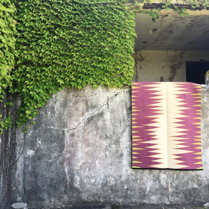 Pembe renk dışında %100 doğal boya ile boyanan Anadolu yünü kullanılarak elde dokunmuştur.