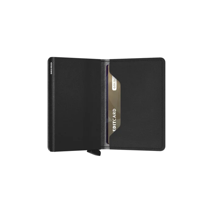 Secrid Slimwallet, Miniwallet'a benzer ama çıtçıtlı kapatması yoktur ve daha incedir. Slimwallet, bir ceketin göğüs cebine kolayca sığar. Slimwallet derisi Miniwallet derisinden daha geniş kesilmiştir. Bu, ekstra kartlar, makbuzlar, kartvizitler ve fişler için alan sunar. Slimwallet, bozuk paralar için pek uygun değildir. Kabartmalı 4 kart veya 6 düz kart kapasitesi vardır. 4 ekstra kart 4 ekstra kart Banknot Kartvizitler Gelirler. 65 x 102 x 21 mm