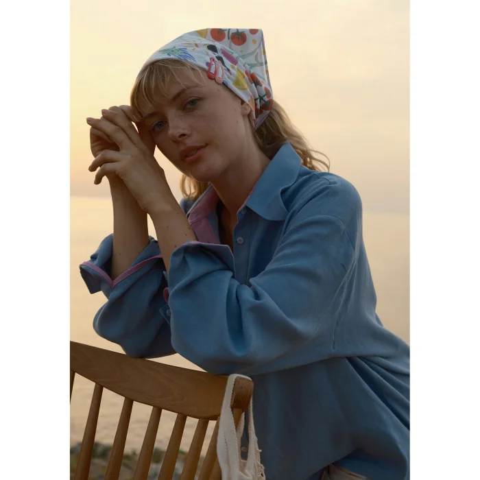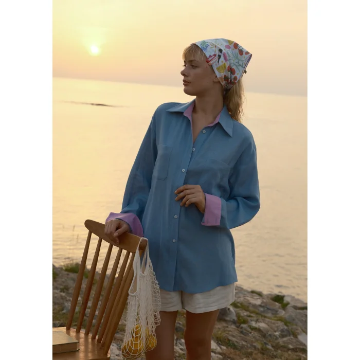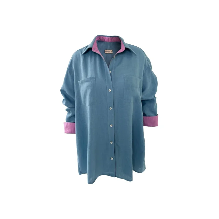 Manşet, yaka ve düğme şeridinde pembe kumaş kullanılmıştır.