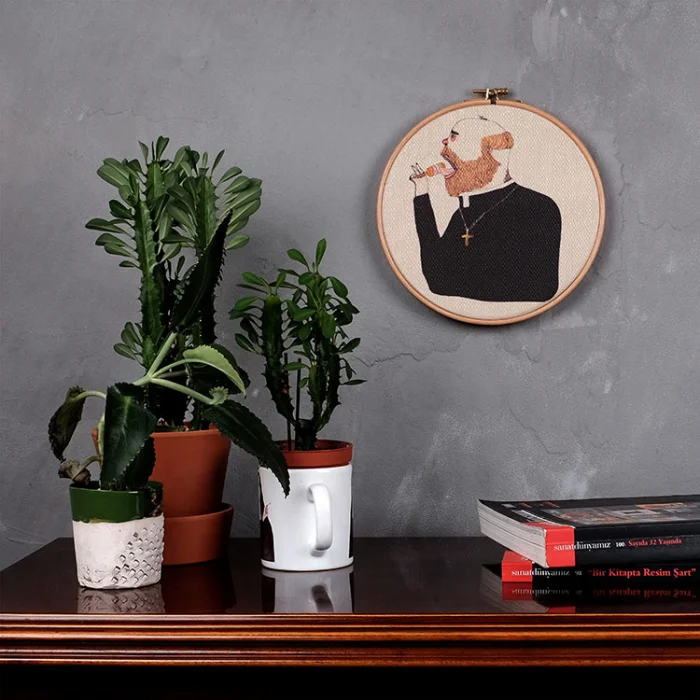 Kasnak üzerine kumaş gerilerek üretilmektedir. Serkan Akyol'un istenilen her çizimi uygulanabilmektedir.