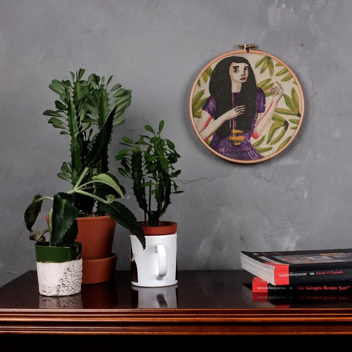 Serkan Akyol'un çizimlerinden keten kumaş üzerine dijital baskı alınarak hazırlanılmaktadır.