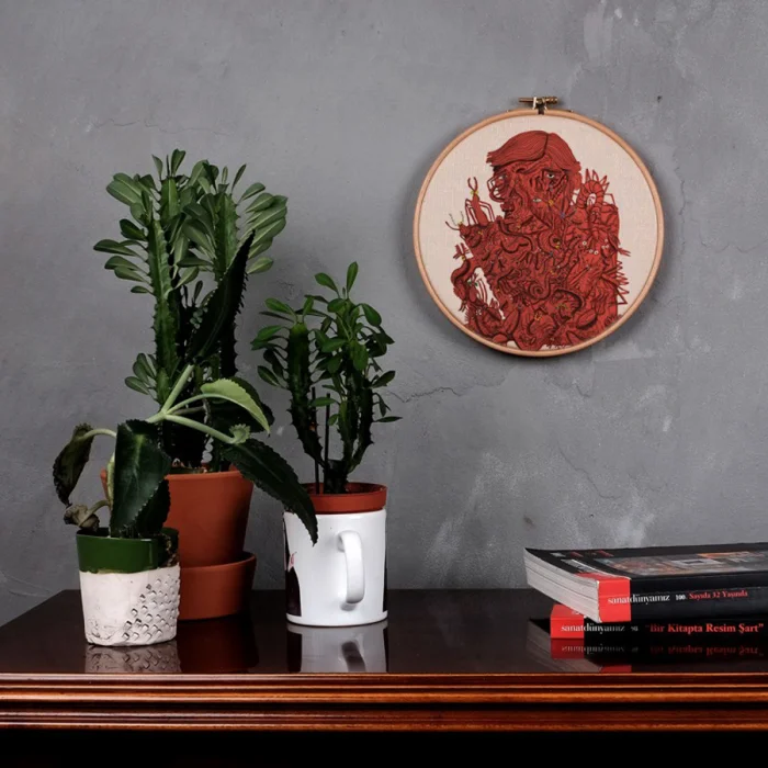 Serkan Akyol'un çizimlerinden keten kumaş üzerine dijital baskı alınarak hazırlanılmaktadır.