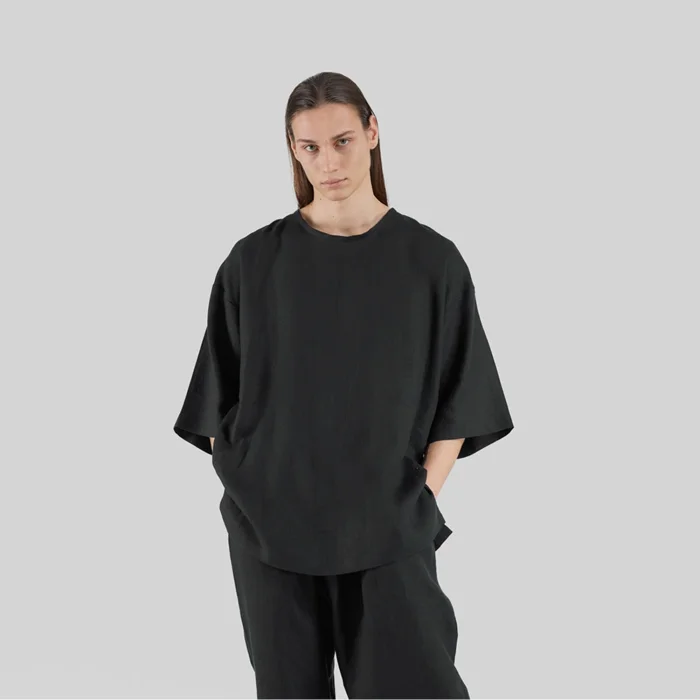 Siyah %100 Keten Yuvarlak Yaka Oversized Unisex T-shirt