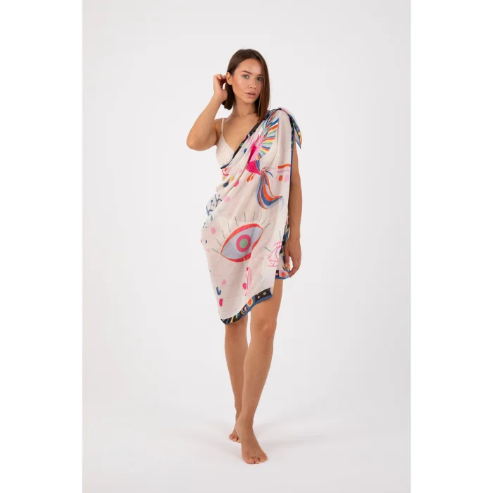 Kumaşın özelliğinden dolayı pareo olarak tasarlanan ürünümüz istenirse omuz şalı olarak da kullanılabilir.
