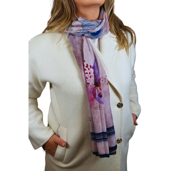 •Fular desenimiz tasarımcımız tarafından özgün çizimlerle elde ve dijital olarak çizilip kumaşa basılmıştır.