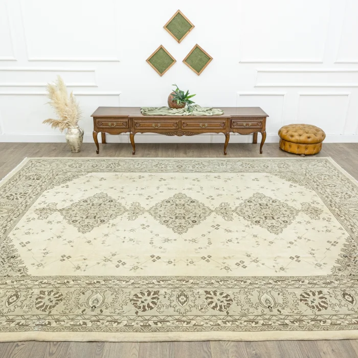 Soho Antiq halı modellerimiz, gösterişli ve estetik tasarımlarıyla yaşam alanınıza yeni bir hava katmak için ideal seçenekler sunuyor. Uzun ömürlü halılarımız, tamamen doğal yün ve pamuk kullanılarak el dokuma tekniğiyle tasarlanır. Bu özel halılar, yıllar geçse de kalitesini korumasını sağlayan beceriyle üretilir ve 1 - 3 cm arasında değişen bir kalınlığa sahiptir. Boyutları ise 298 x 392 cm'dir. Ana rengi açık kahverengi olan halılarımızda çeşitli renk seçenekleri bulunmaktadır. Ayrıca, halı tasarımında kahverengi tonları ve diğer birkaç renk kullanılmıştır.