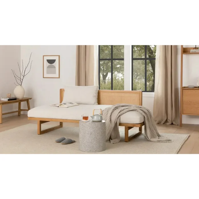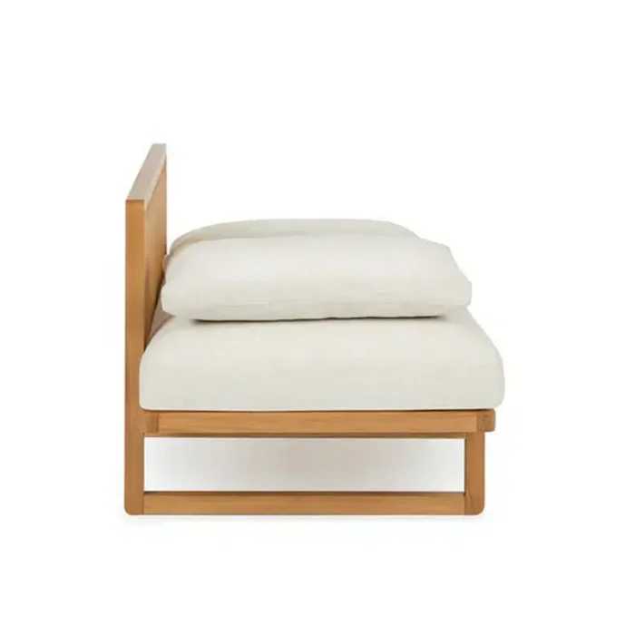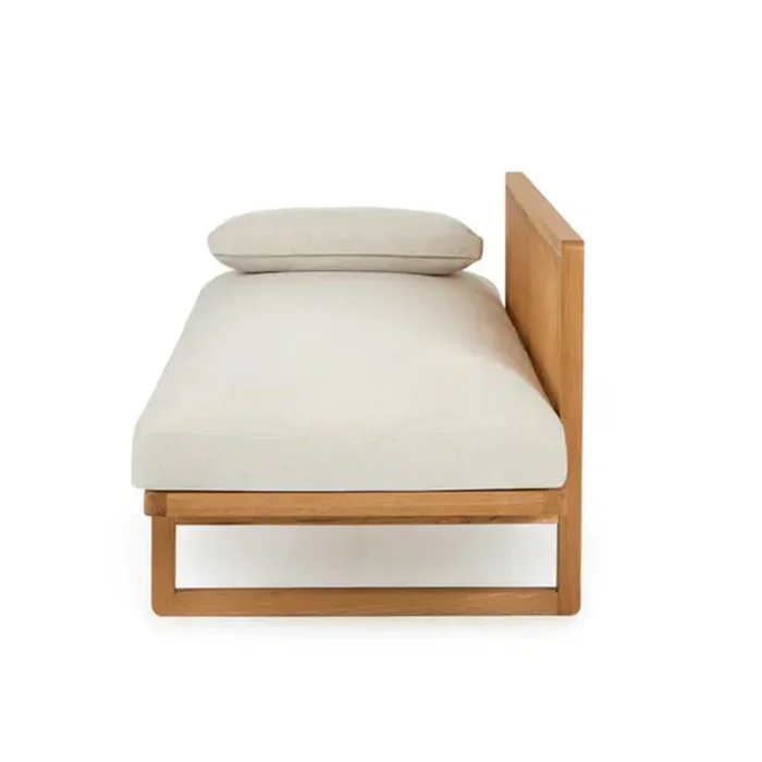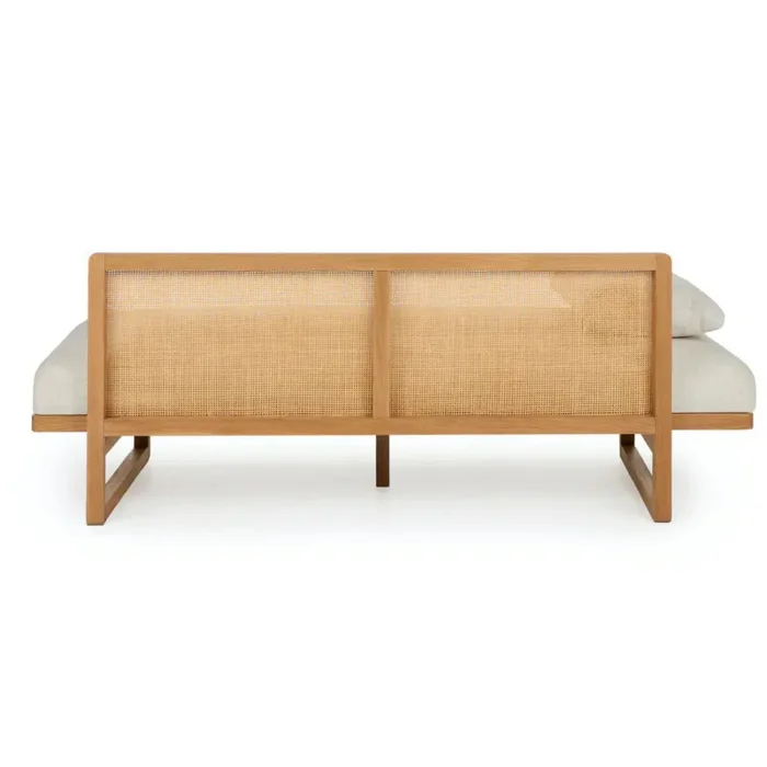 Ürünün iskeleti doğal gürgen ağacıdır. Sırt kısmında doğal hazeran kullanışmıştır. Kumaş olarak beyaz keten tercih edilmiştir. Oturum kısmında sünger ve silikon, yastık da dolgu malzemesi olarak silikon kullanılmıştır. 190*80*73 cm ölçülerindedir.