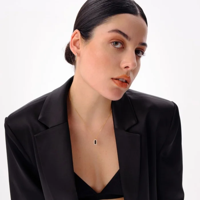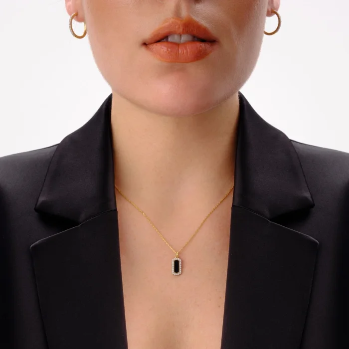 925 Gümüş Üzeri 14k Mikron Altın Kaplama. Siyah Mine. Zirkon. Gümüş Ağırlık : 2,15 g. Kolye Ucu Boyu: 7x13 mm. Zincir Uzunluğu: 42 cm. Ürün sertifikalıdır.