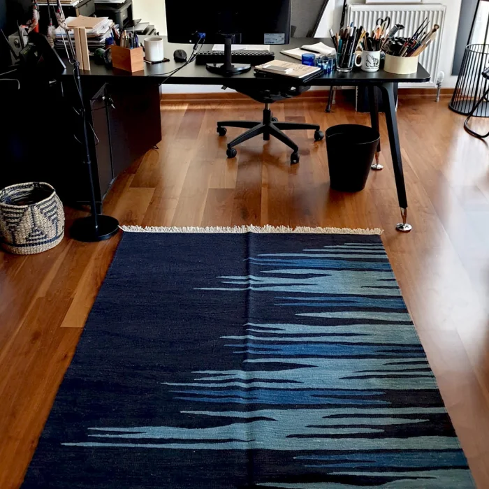 Anadolulu dokuyucular tarafından elle dokunmuştur. El yapımı oluşu her kilime biricik ve kendine özgü karakterini verir. Doğal kök boyalarla renklendirilmiş Anadolu yünü kullanılmıştır. Kilimlerimiz el dokuması olduğu için kilimden kilime ufak renk, boyut ve şekil farklılıkları olabilir. Tasarımcı: Fulden Topaloğlu