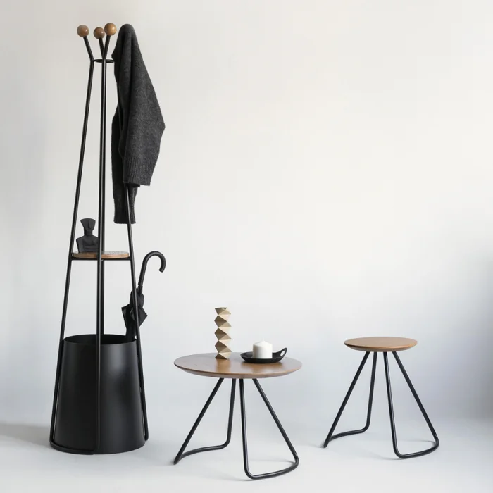 Hem tabure hem de sehpa olarak kullanılabilen bu ürün, ahşap ve metal zanaatkarları tarafından elle üretilmiştir. Oturak: Huş kontrplak üzeri meşe kaplama. Ayaklar: Büküm metal boru üzeri elektrostatik boya. Tasarımcı: Fulden Topaloğlu