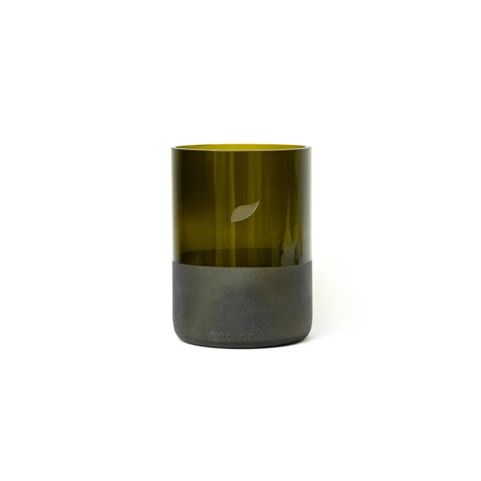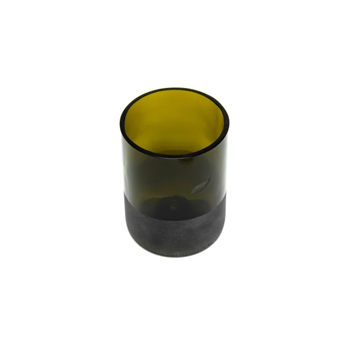 Bu ürün restoranlardan toplanan atık şişelerin dönüştürülmesiyle elde edilmiştir. Elde kesilmiş, törpülenmiş, cilalanmış ve kumlanmıştır.