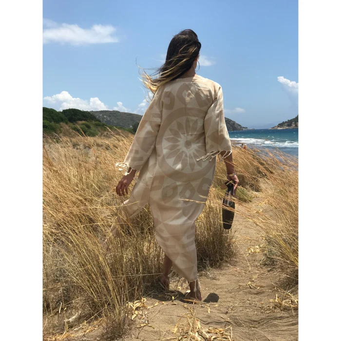 Zamansız bir şıklığın anahtarı: %100 pamuk, jakarlı dokusuyla öne çıkan bu uzun kimono; plajdan şehir stiline kadar gün boyu size eşlik eder.