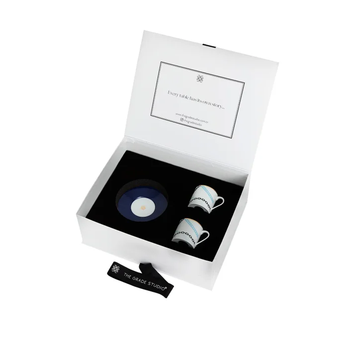 2'li olarak satılmaktadır. Kutu içeriği 2 adet kahve fincanı ve 2 adet fincan tabağıdır. Hacim: 90 ml. En yüksek kalitede ince porselenler, son teknoloji baskı teknikleri ile birleştirilmiştir. Desenlerimiz el çizimleridir. Tasarımlarımız gerçek altın ile dekore edilmiştir. Görseldeki kadife kaplı korumalı kutu ile gönderilecektir.