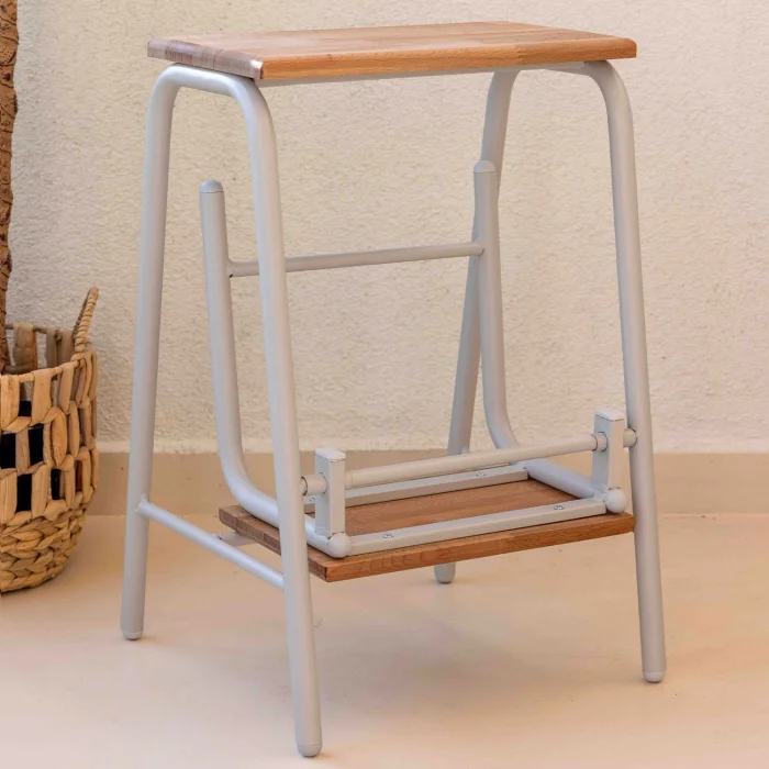 Ahşap Tabure Merdiven 2 Basamaklıdır.Ürün Malzeme: Ahşap ve MetalMetal kısımlar metal profilAhşap kısımlar kayın tahtaÜrün ölçüsü:Kapalı: 37x20x56 cmAçık:37x54x56 cm1. Basamak: 19x31x30 cm2. Basamak: 20x37x56 cm2 basamak arası yükseklik 26cm Hem tabure olarak kullanılabilen hem de küçük bir merdiven olarak işlev gören pratik ve şık bir üründür. Metal iskeleti ve ahşap basamaklara sahip olan bu ürün oldukça minimal ve estetik bir görüntü sağlar. Kullanım Alanları:Ev içinde yüksek raflara erişim.Mutfak, oturma odası veya ofis gibi yerlerde tabure olarak kullanımı.Dekoratif amaçla bitki ya da aksesuar yerleştirme.Alt basamağı yukarı çekilerek veya sabitlenerek tabure formuna dönüştürülebilir.Hafif nemli bez ile temizlenmesi önerilir.